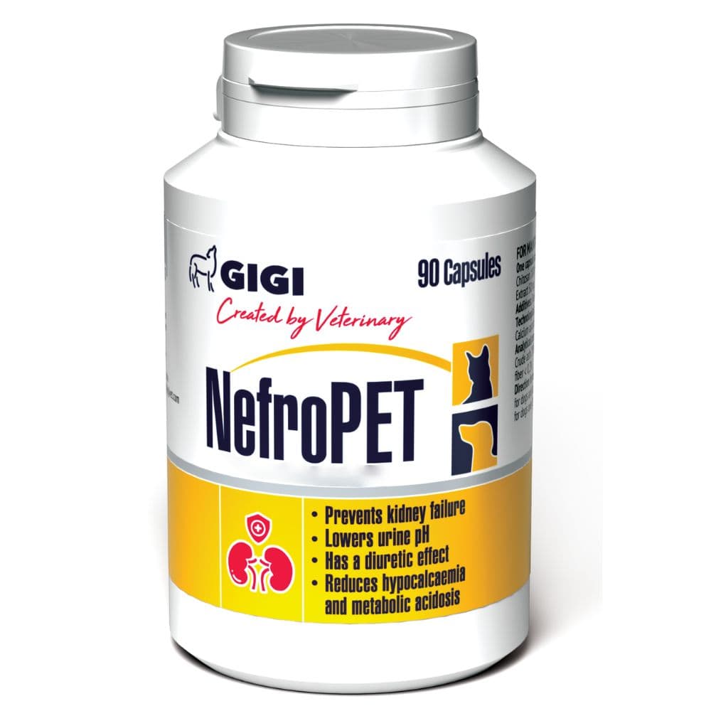 Papildbarība suņiem un kaķiem, urīnsistēmas un nieru funkcionālās darbības uzturēšanai. Novērš nieru mazspējas risku, pazemina urīna pH līmeni, piemīt diurētiska iedarbība, samazina hipokalciēmiju un metabolisko acidozi. Sastāvs: 1 kapsula (0,7 g) satur: hitozāns, Ester C vitamīna (kalcija askorbāta veidā), Astragalus ekstrakts. NefroPET lieto urīnizvadceļu un nieru funkcionālās darbības uzturēšanai. Hitozāns ir dabīgs polisaharīds, kuru iegūst no krabju un garneļu čaulām. Hitozānam piemīt izteiktas toksīnu adsorbcijas spējas; asinīs hitozāns pazemina urīnvielas slāpekļa daudzumu, novērš nieru bojājumus, uzlabo dzīvnieka dzīves kvalitāti. Kalcija askorbāts (Ester C®) - jauna patentēta vitamīna C forma kalcija askorbāta veidā. Ilgstošas lietošanas gadījumā Ester C® nekairina kuņģa gļotādu, neatstāj negatīvu ietekmi uz zobu emalju. Ester C sekmē citu NefroPET komponentu iedarbību, pazemina urīna pH. Astragala ekstrakts (Astragalus) nieru slimību gadījumā paplašina asinsvadus nierēs, sekmē diurēzi; to lieto nieru nepietiekamības un urīnizvdceļu slimību gadījumos. Astragals ir augu izcelsmes hipoazotēmisks līdzeklis - uzlabo nieru apasiņošanu un slāpekli izvadošo funkciju, pazemina atlikušā slāpekļa, urīnvielas, kreatinīna saturu asinīs, darbojas diurētiski, samazina iekaisumu un pazemina kapilāru caurlaidību. Kalcija karbonāts kavē fosfora uzsūkšanos gremošanas traktā, veidojot nešķīstošus fosfāta savienojumus, samazina nieru nepietiekamības simptomus. Kalcija karbonāts samazina hipokalcēmiju un vielmaiņas acidozi.